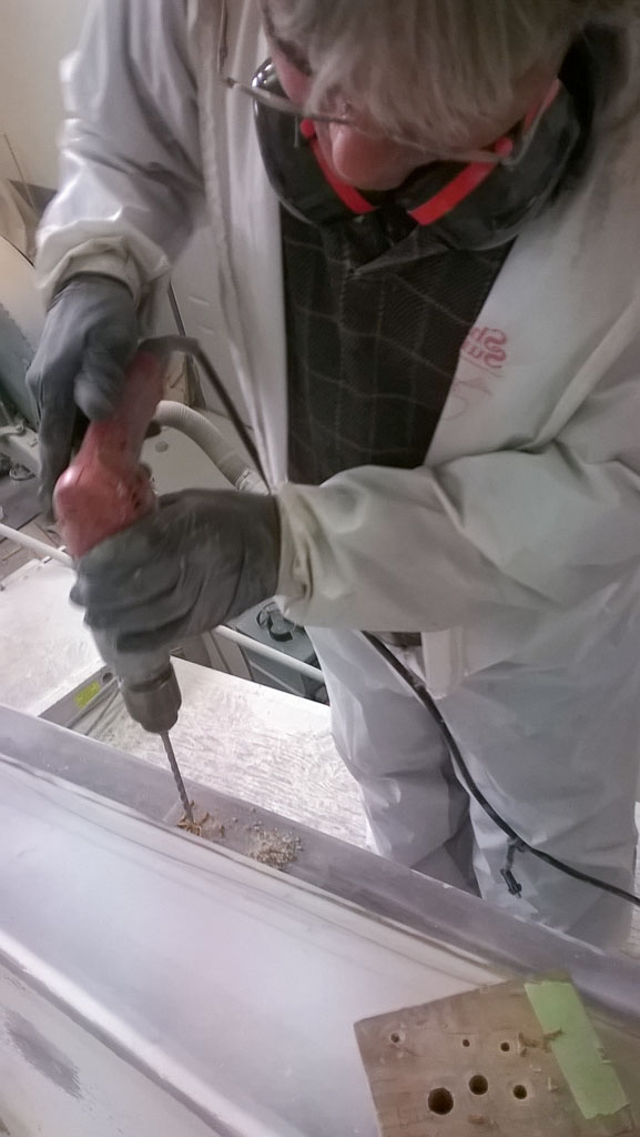 The screw holes being drilled to fit to 1/4″ bolts. They will be over drilled to 1/2″ and filled with epoxy. Third time’s a charm for putting the toe rail back on to redrill the proper sized holes for the final fit.