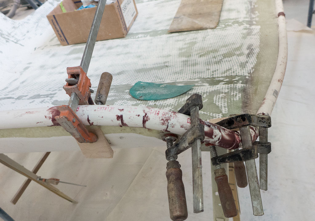 While we have been working Tom and Chris have been finishing the cockpit combings. We will be able to comfortably sit on them as well as have real estate for winches and cleats.combingThe dodger has been moving along. We epoxied PVC pipe to the curved parts. This took a bit more clamping.