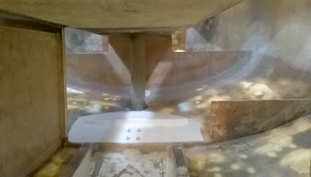 This week we’re starting from the front and working back.  In sailing terms: forward to aft.  Tom fiberglassed the new platform for the windlass in place and Bill drilled the really big holes.  The platform was needed to get the chain feed from the anchor roller to the windlass level.  Nina is looking forward to having an electric windlass so that she will no longer need to be the cranking lass to get the anchor up or down.