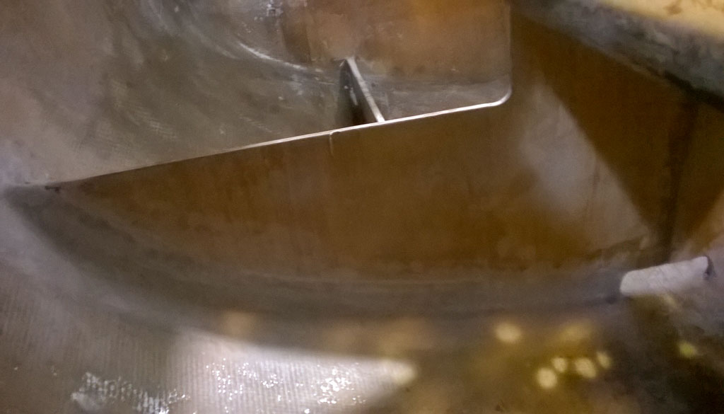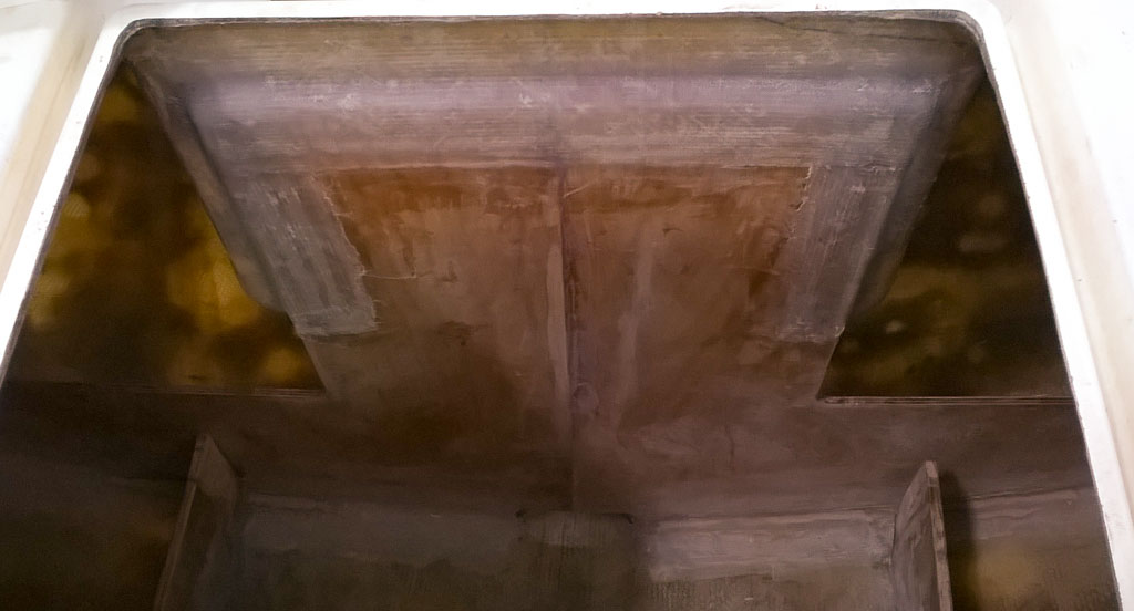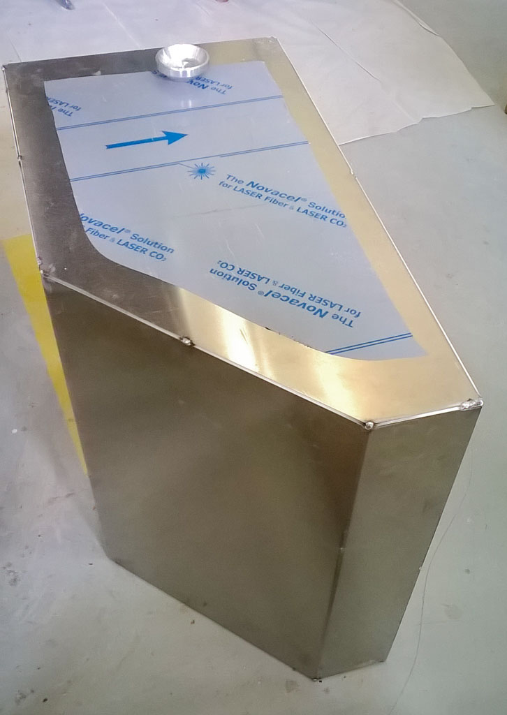 The fuel tank. It fits! It will block the view of the bulkhead. It has a 60 gallon capacity. The angled side will be the after bottom side. (It is on its side in the photo).