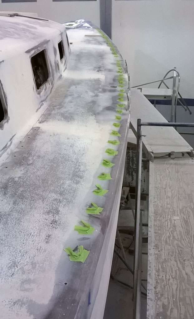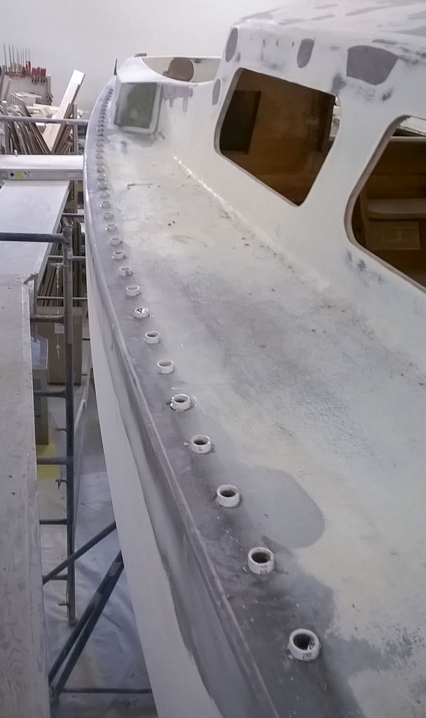 Dams for toe rail holes made out of pvc pipe. They are glued down with dabs of Bondo.