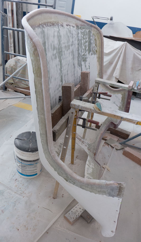 Nina’s bulkhead project was installed!  The pieces of wood were epoxied together with a spline and glued to the after end of the cockpit.  She also made fillets on both sides at the bottom to make fiberglassing them in place easier.  They were sanded to smooth them up for the glass cloth and resin, and sanded once the glass was in place and cured.  She was quite pleased to be told by Tom that she’d done a good job!