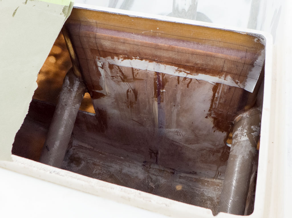 We made our dorade boxes. The molds were ready to go with a coat of wax and gel coat. We added two layers of fiberglass mat followed by three layers of biax cloth on the sides and 5 layers of biax on the tops. These are going to be stout boxes. (Dorades are water trap vents, they have a cowl vent on top, drains on the bottom and a air tube that lets air into, but keeps water out of the cabin.)