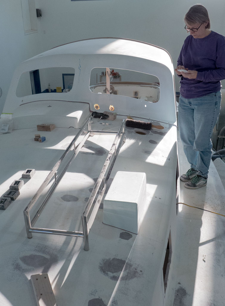 It has been a week filled with dust and shavings. Friday we re-drilled all of the toe rail holes after they had been cast with epoxy. That’s one more job off the list. The cabin, cockpit locker and dodger have been sanded some more. We want to be able to paint the insides of the cabin where the ports will go and where the engine, fuel and water tanks will be.
