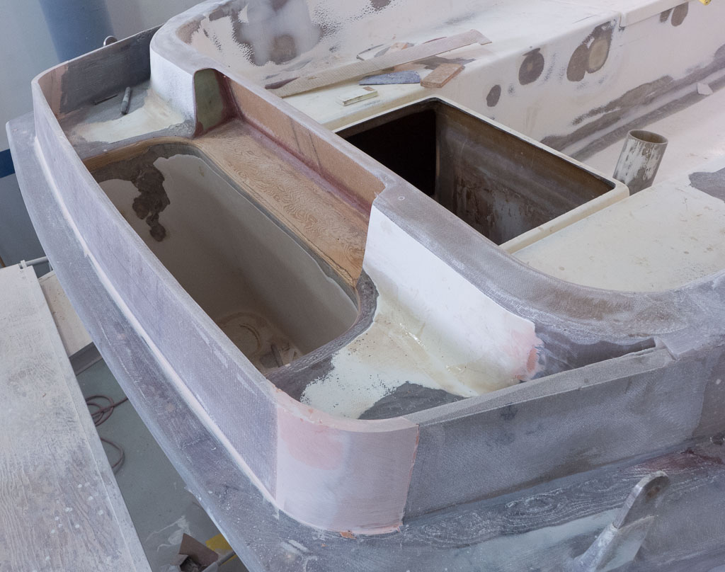 The bulkhead to support the cockpit was fiberglassed, but it had not been sanded properly first. The fiberglass popped off, it was a sad day. Here is try two. This one did actually stick.