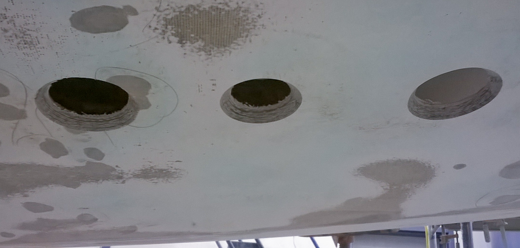 The other exciting thing that happened is the holes for the thru-hulls got cut out. thru-hulls are valves in the bottom of the boat that let water in or out. These are at least 1 1/2 inches in diameter, so you make the boat watertight and then cut big holes into it. The thru-hulls will be flush with the hull to reduce drag.