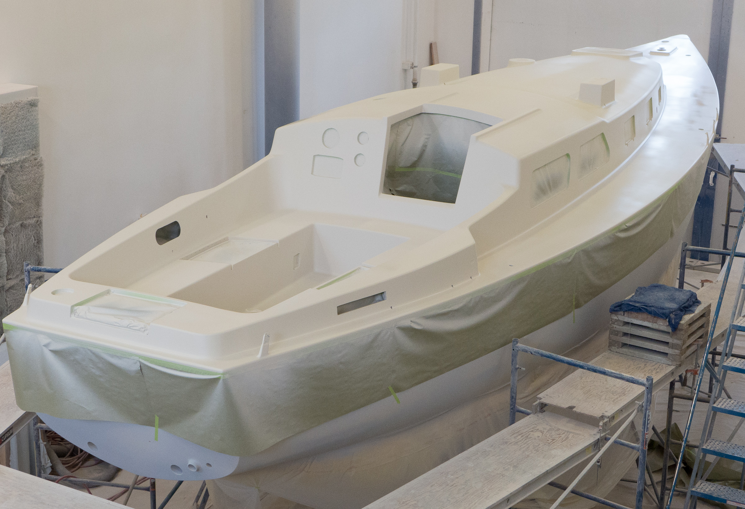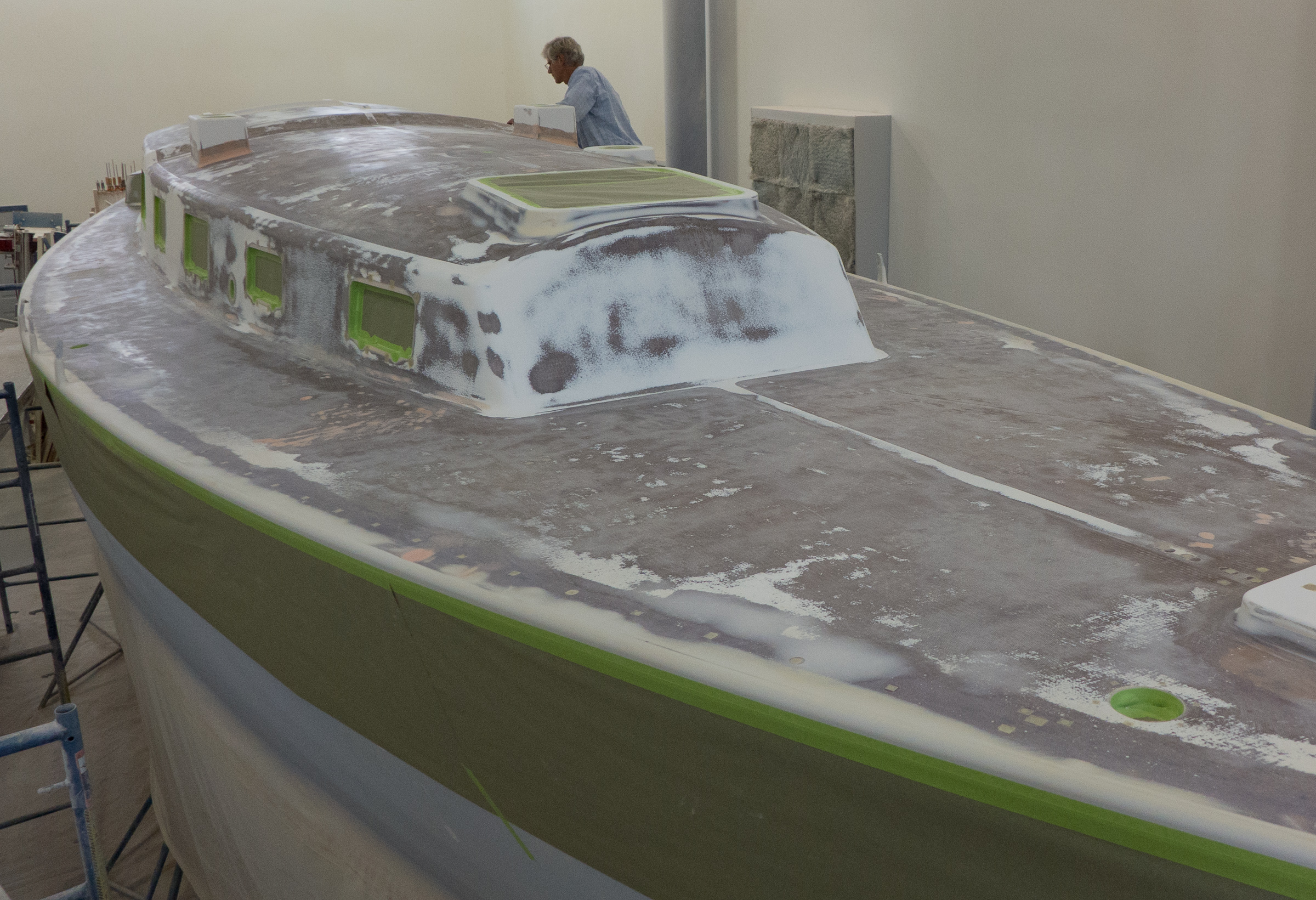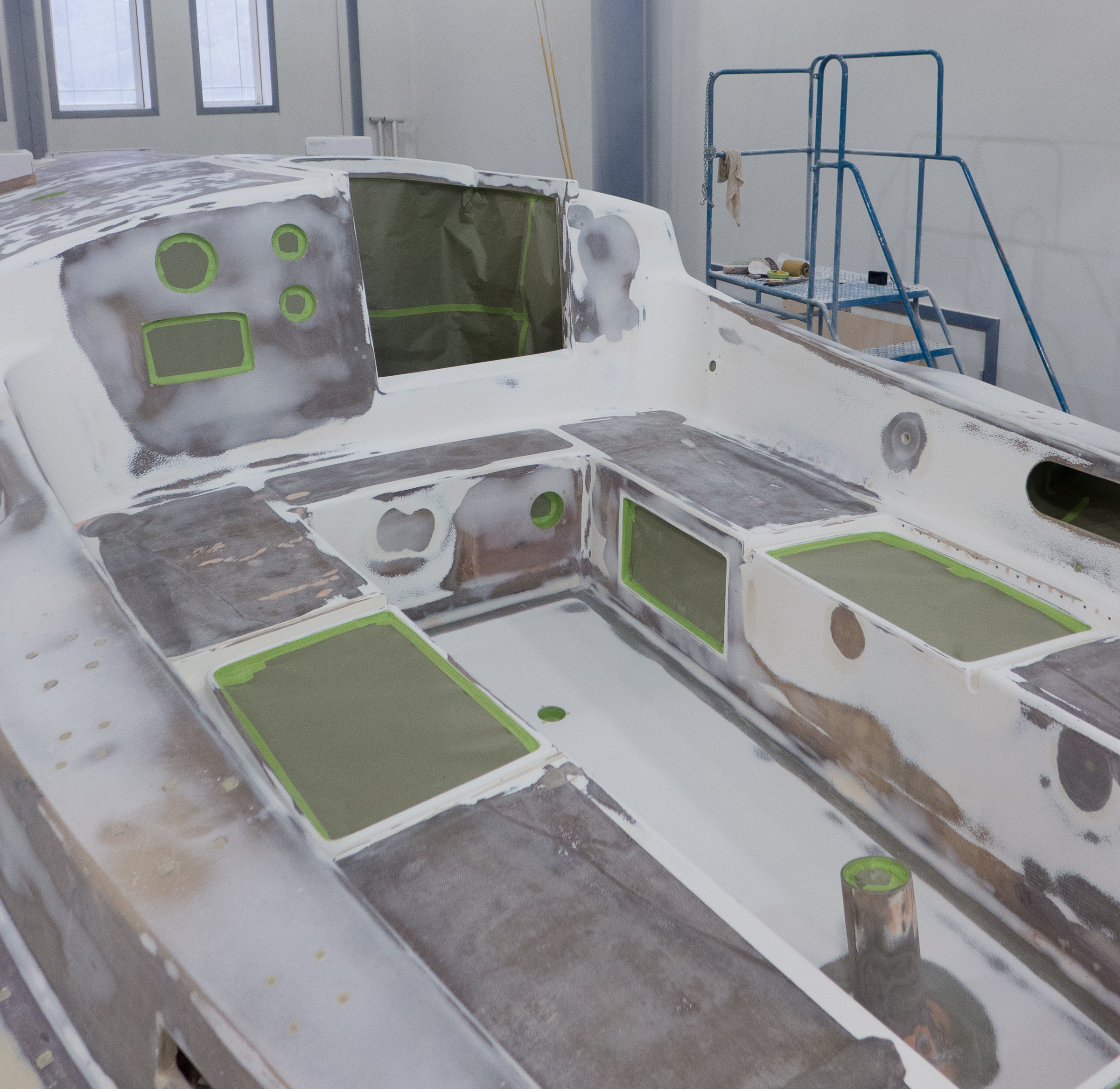 There are times when you go from one stage to the next. This weekend was one. Sunday the task was to tape the deck for painting. We needed to tape over all the holes for the hardware so they would not get clogged with paint. We also had to paper all the openings; ports, hatches, instruments, you name it. Hundreds of little squares of tape plus paper and more tape until we got the deck covered. This took all day.