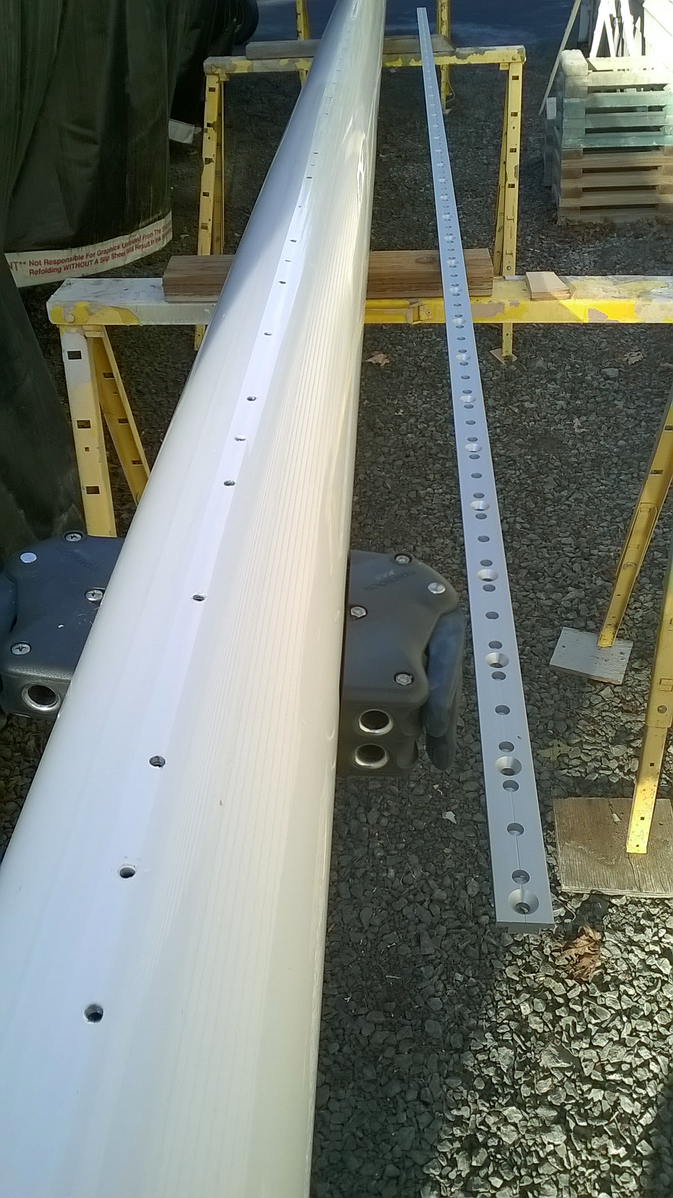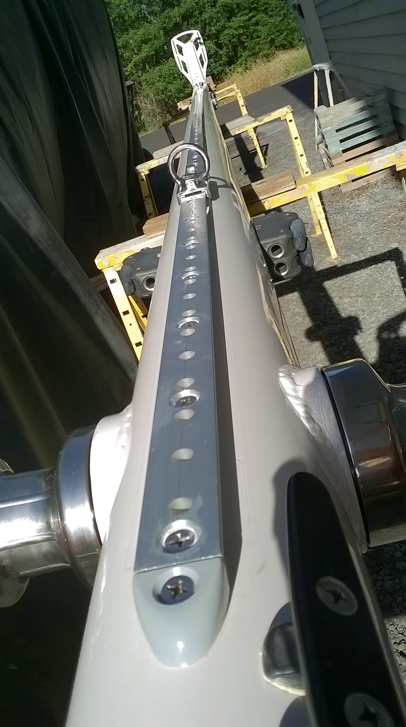 The mast and the new track for the spinnaker pole.  Very few of the old holes lined up, so more holes were drilled.