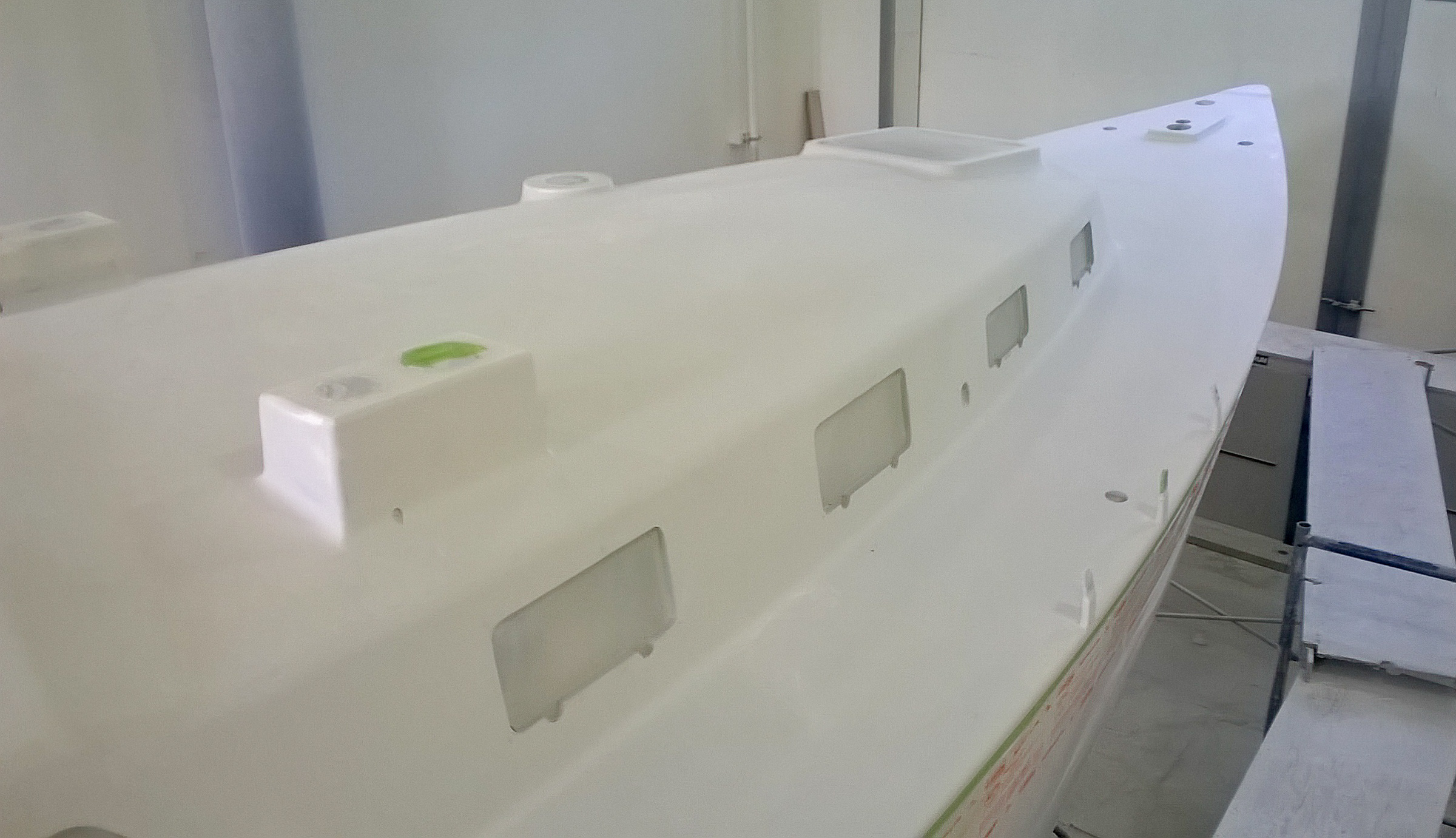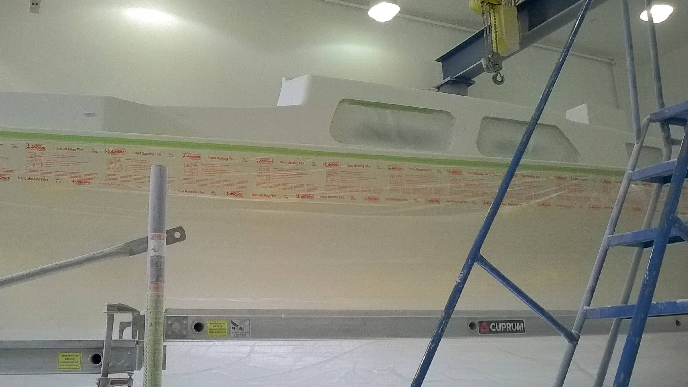 Ready for primer.  Because of the way schedules are going, the top will be painted first.  The hull is masked off with plastic.  The top of the boat really looks different when it’s all one color!