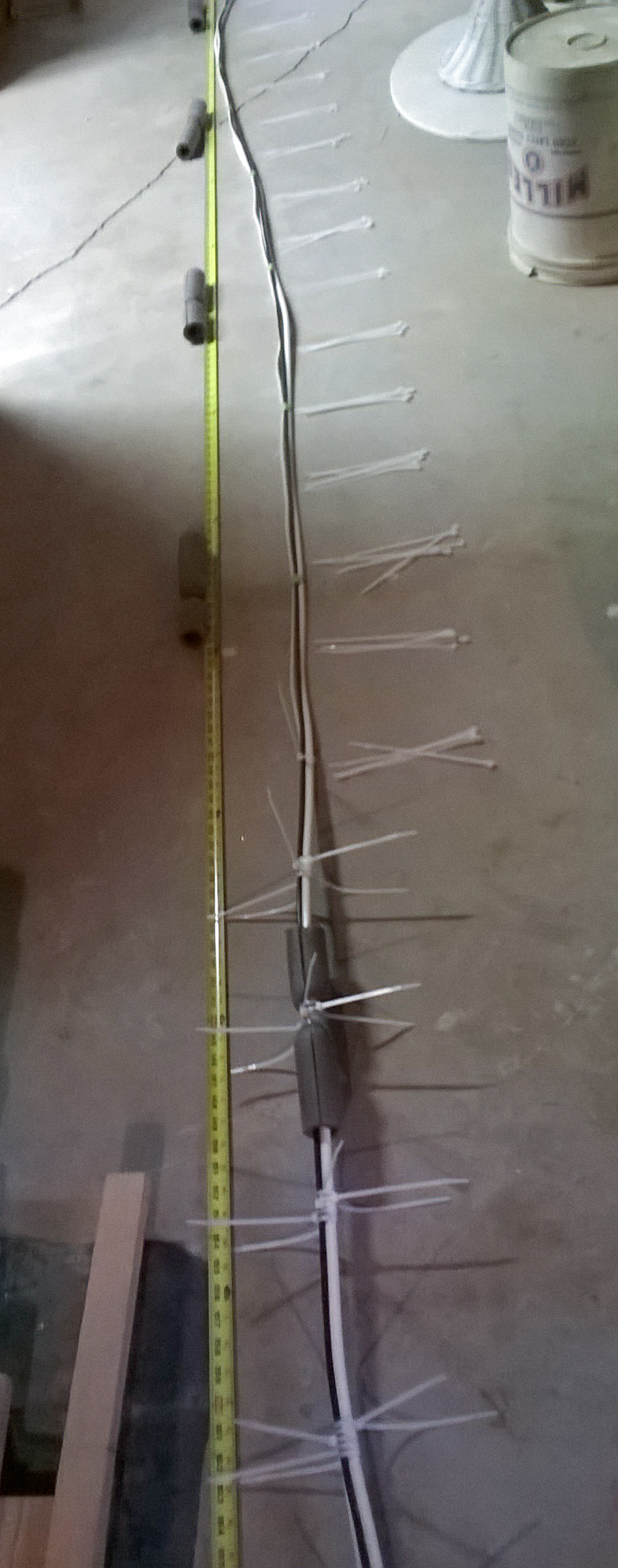 Wrapping the mast wires with cable ties and pipe insulation. Five cable ties, every 8 inches, with pipe wrap every fourth bunch.  The lowers have been installed and the upper set are lined up waiting to be tied.