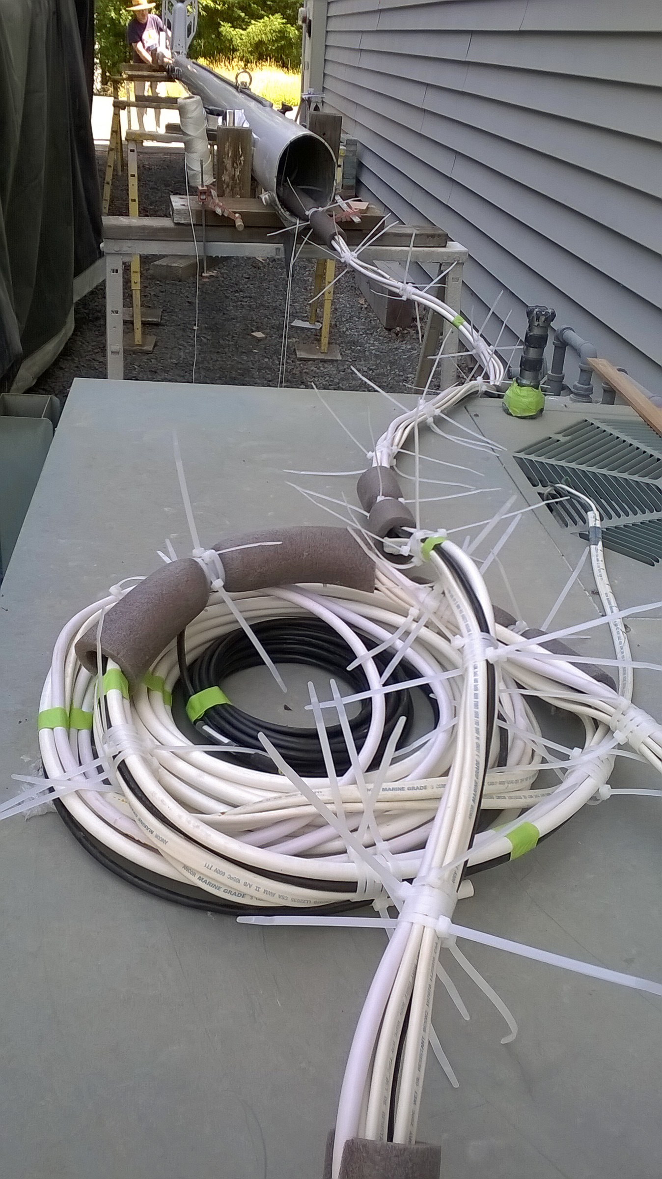 Yes, it was cooler in the basement, but crawling around on your hands and knees on a concrete floor for hours is rough when you are passed middle aged.  After 287 cable ties, it was ready to be installed, or stuffed up the mast.