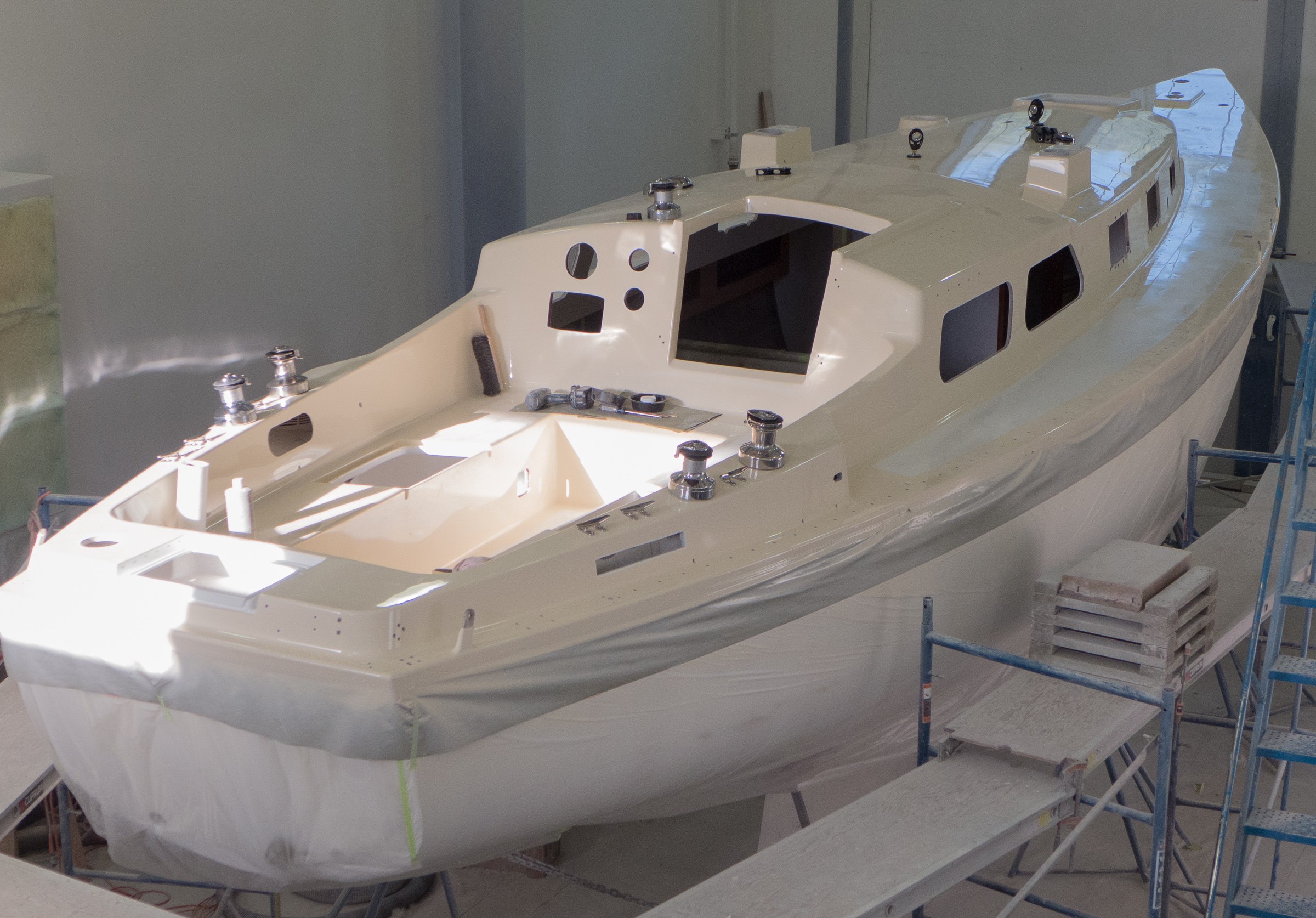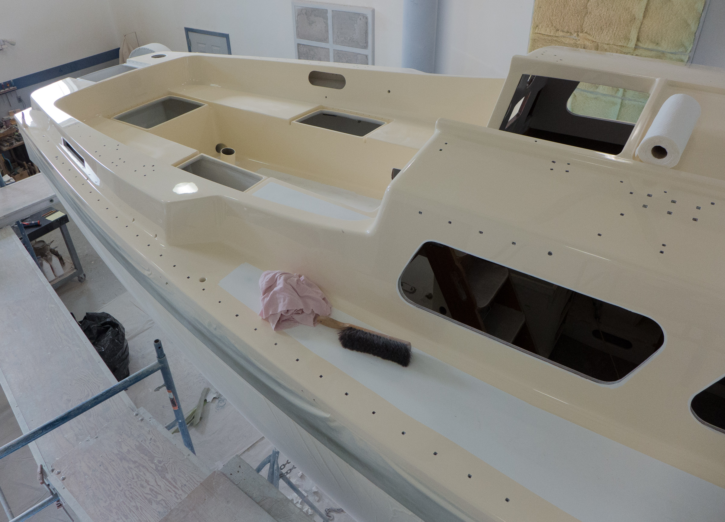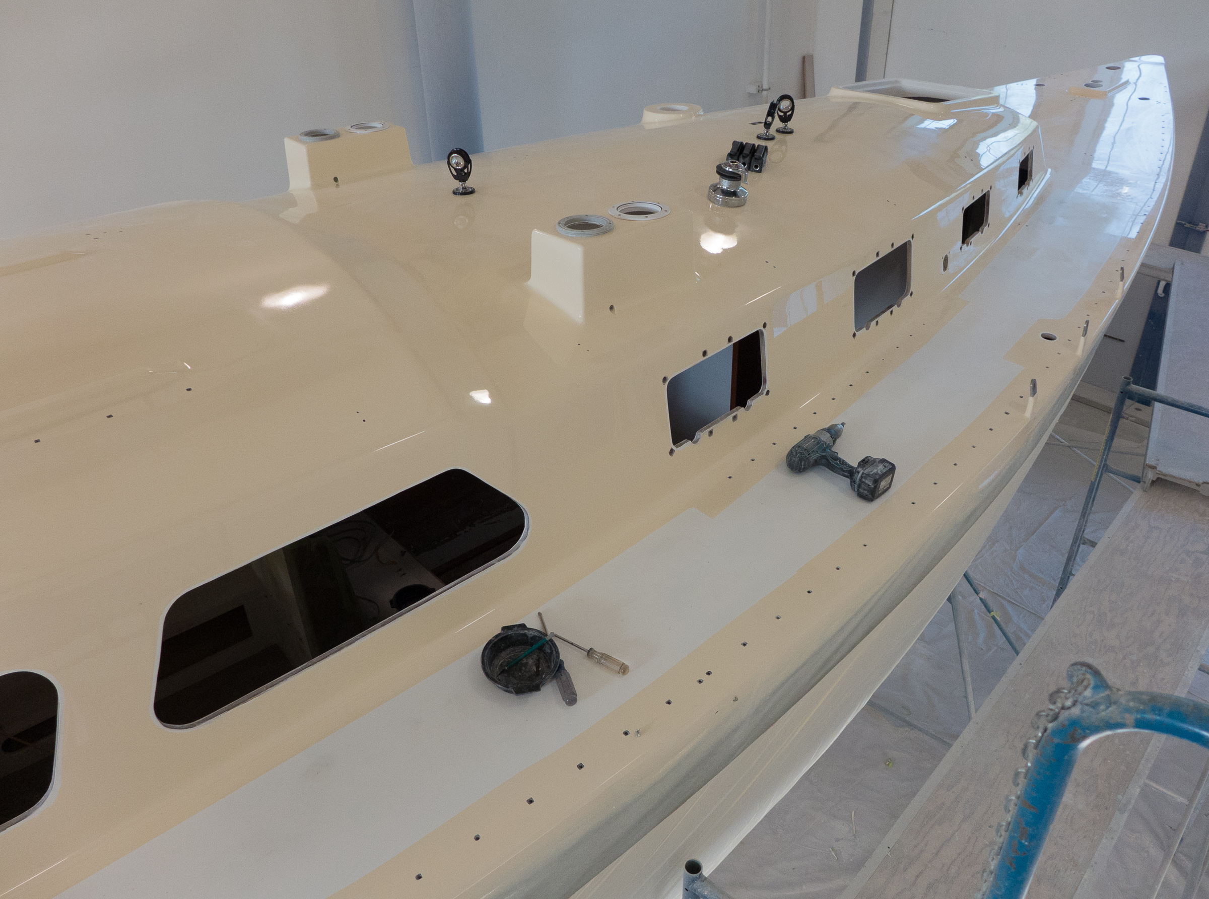 We are very happy with the deck color. It looks like beige, but we prefer to think of it as a rich cream. We did not want to end up with a white boat. The non-skid paint we will apply is a bit lighter in a similar color. The non skid will end up covering about half of the deck and where the white parts are still showing.