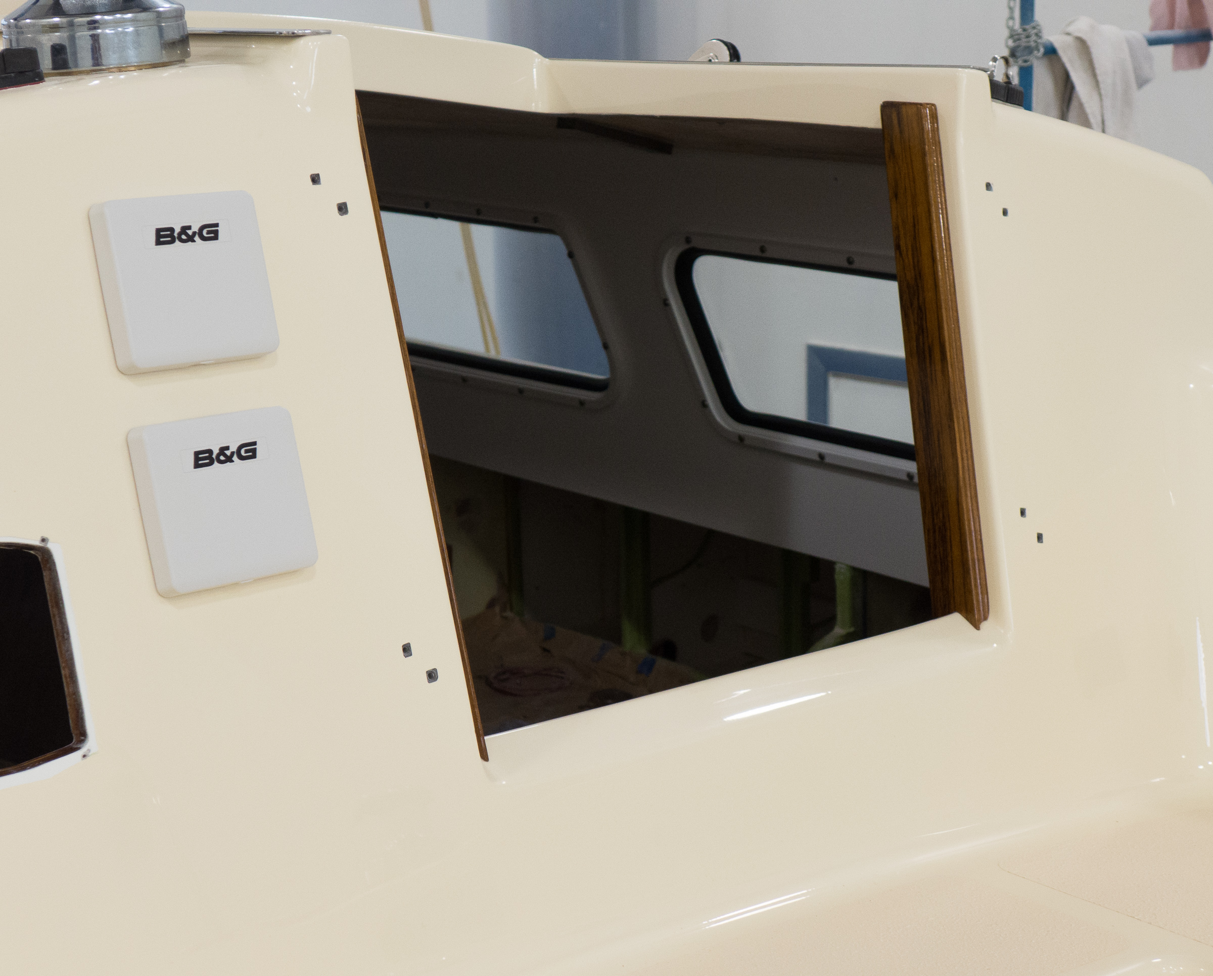 Since last week’s post we have put on another coat of non-skid paint. We just have the side decks, and hatches and dodger left to do. The deck is looking great. We also put the teak trim on the companion way and started installing the sailing instruments.
