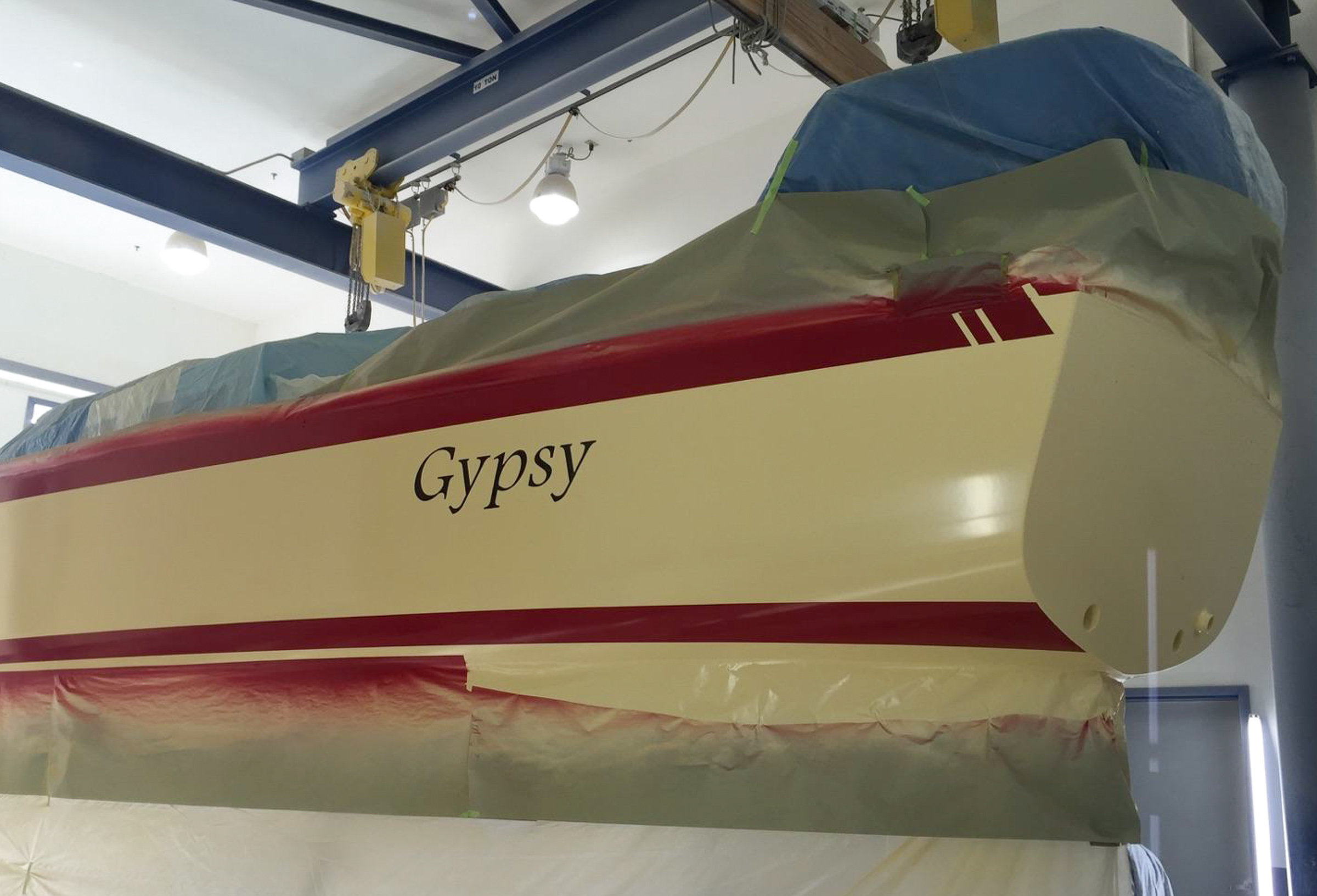 Now what you have been waiting for: the foreshadowed color. We have only seen this via email so we are as excited as you are. Here are the photos that came today of Gypsy’s hull being painted.