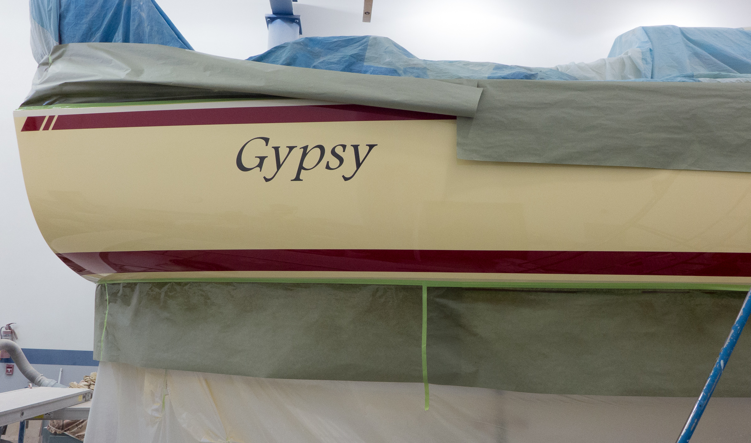 We arrived at the boat shop Sunday morning and we saw Gypsy with her hull painted. The Perfect soundtrack would have been Also Sprach Zarathustra: we were like the cave men finding the stone and it was good.