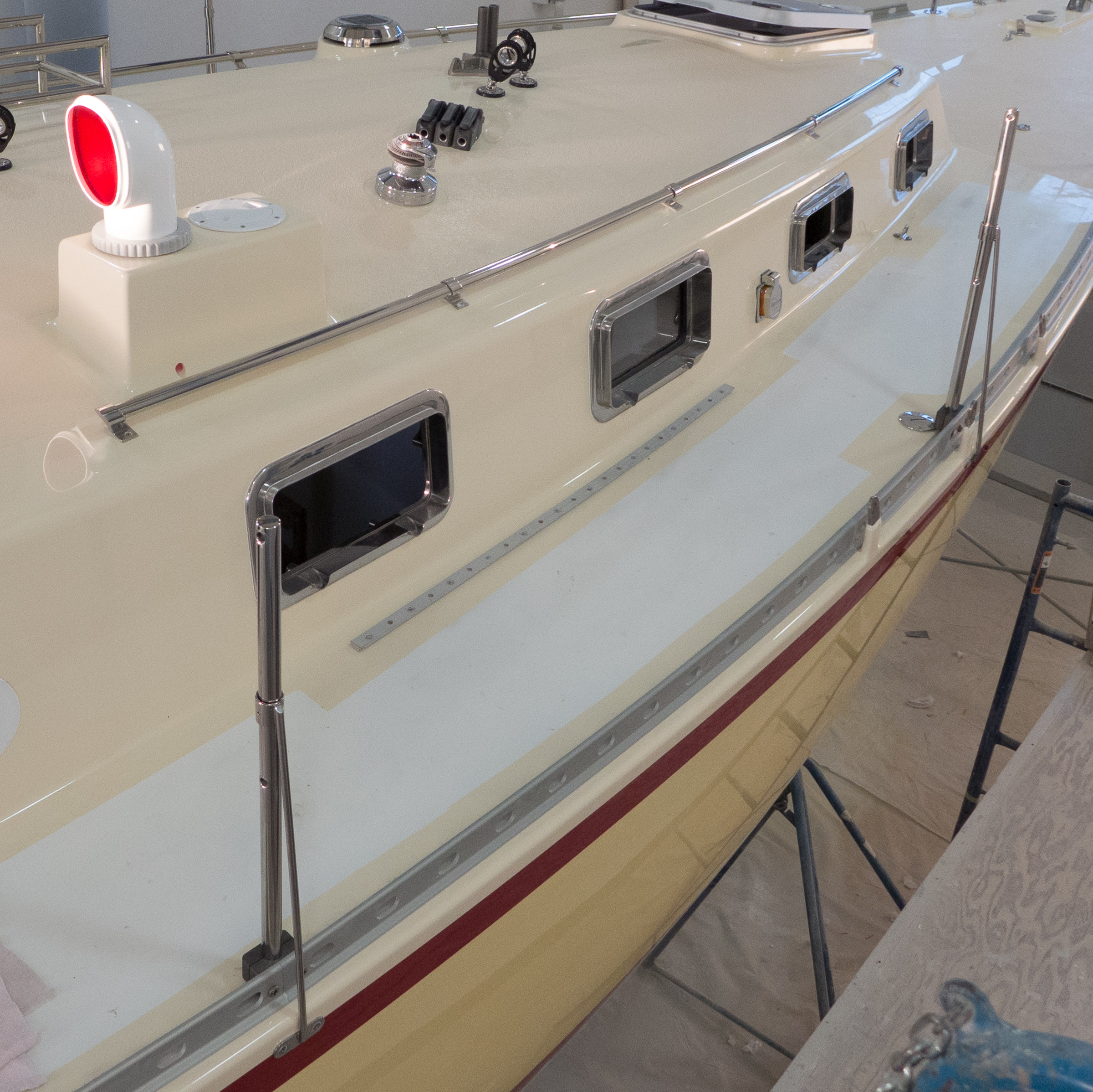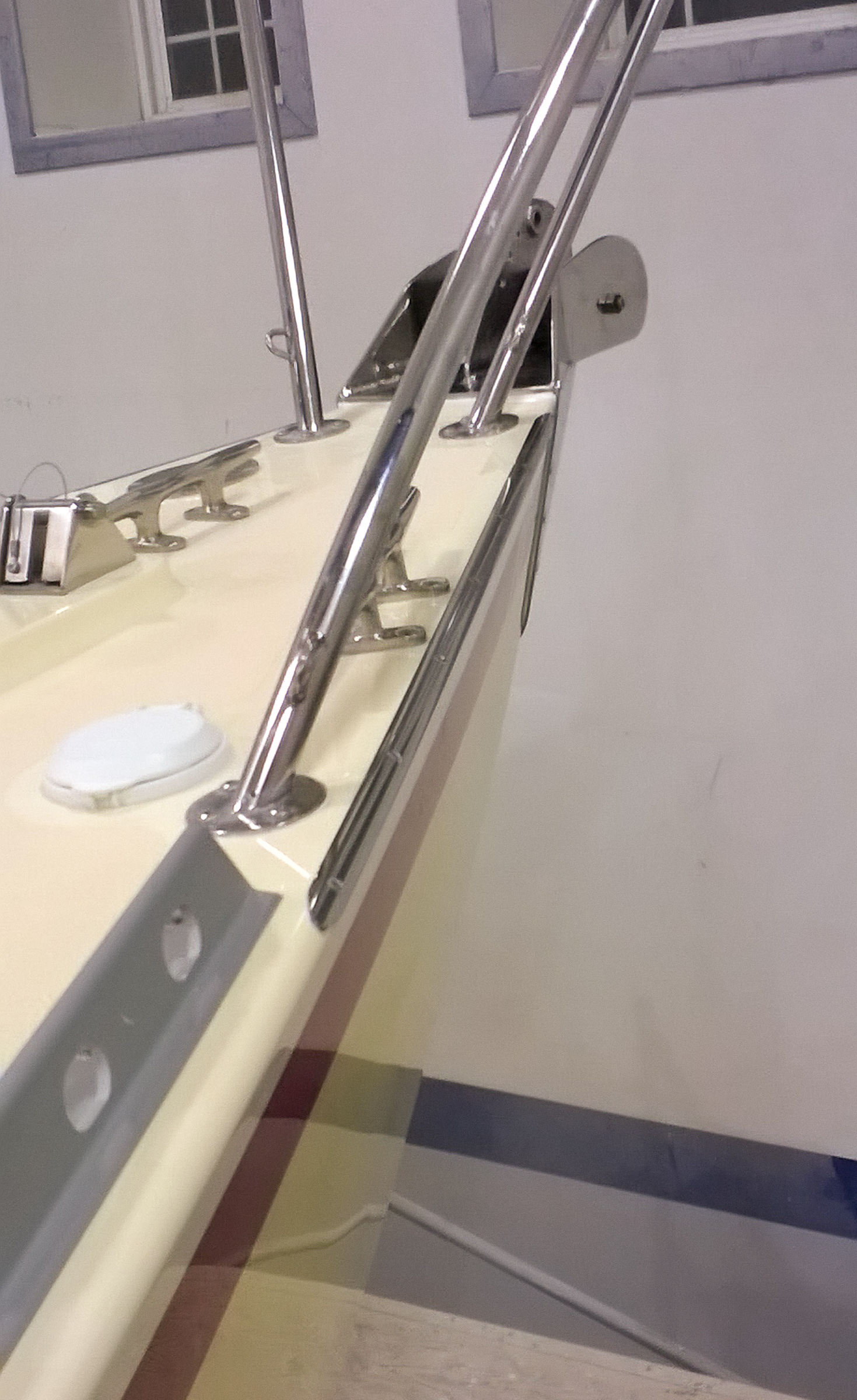 Now that we were warmed up we were ready to tackle the stanchions, which ironically, were not on Tom’s list for us. They are the metal poles that hold the life lines. They actually went in very easily.