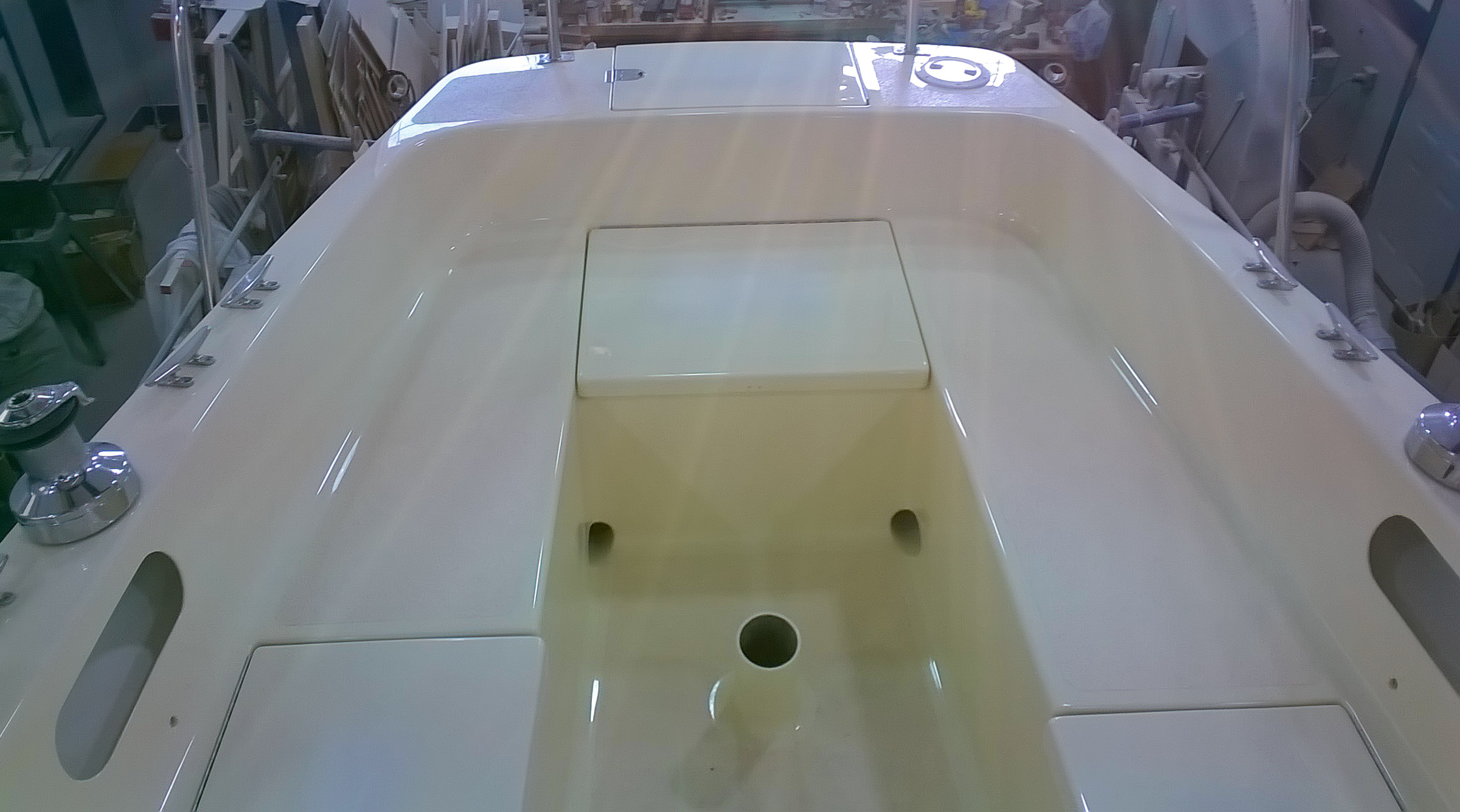 While Bill was working on the mast, Nina was installing the lazarette lid. All of our cockpit locker lids are now installed. Next weekend we will paint them and the side decks with non-skid paint. Now that we know how to tape them off, it should take one day to get that all done.