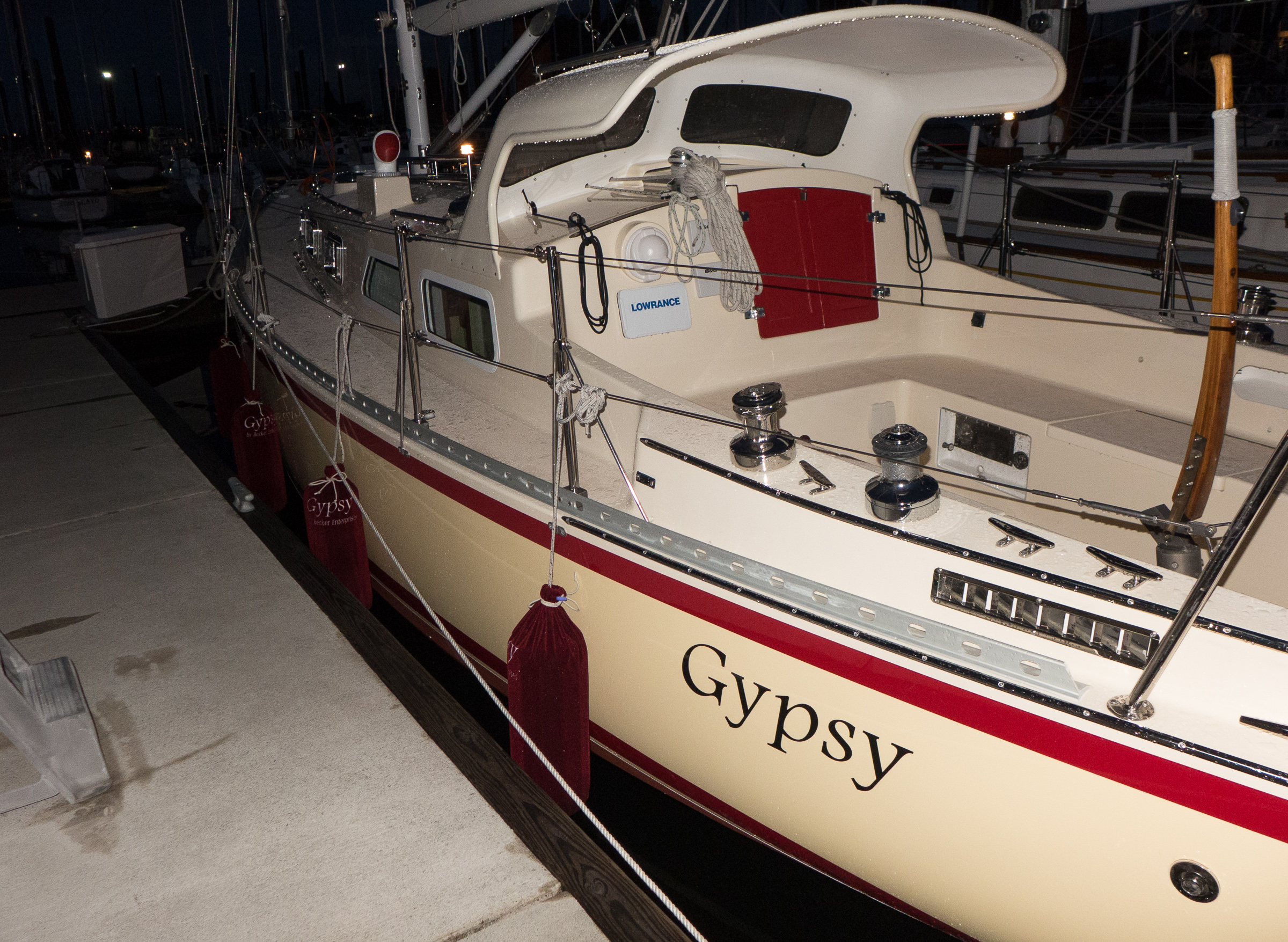 It is great to have Gypsy back in her slip. What a difference a ten minute instead of an hour commute makes. We went down on Friday night and had dinner on Gypsy. Sandwiches, chips and a beer. It was great. We did some work too. We put the boom on the mast and set up the main sheet on the traveler to control the boom. We also installed the vang.