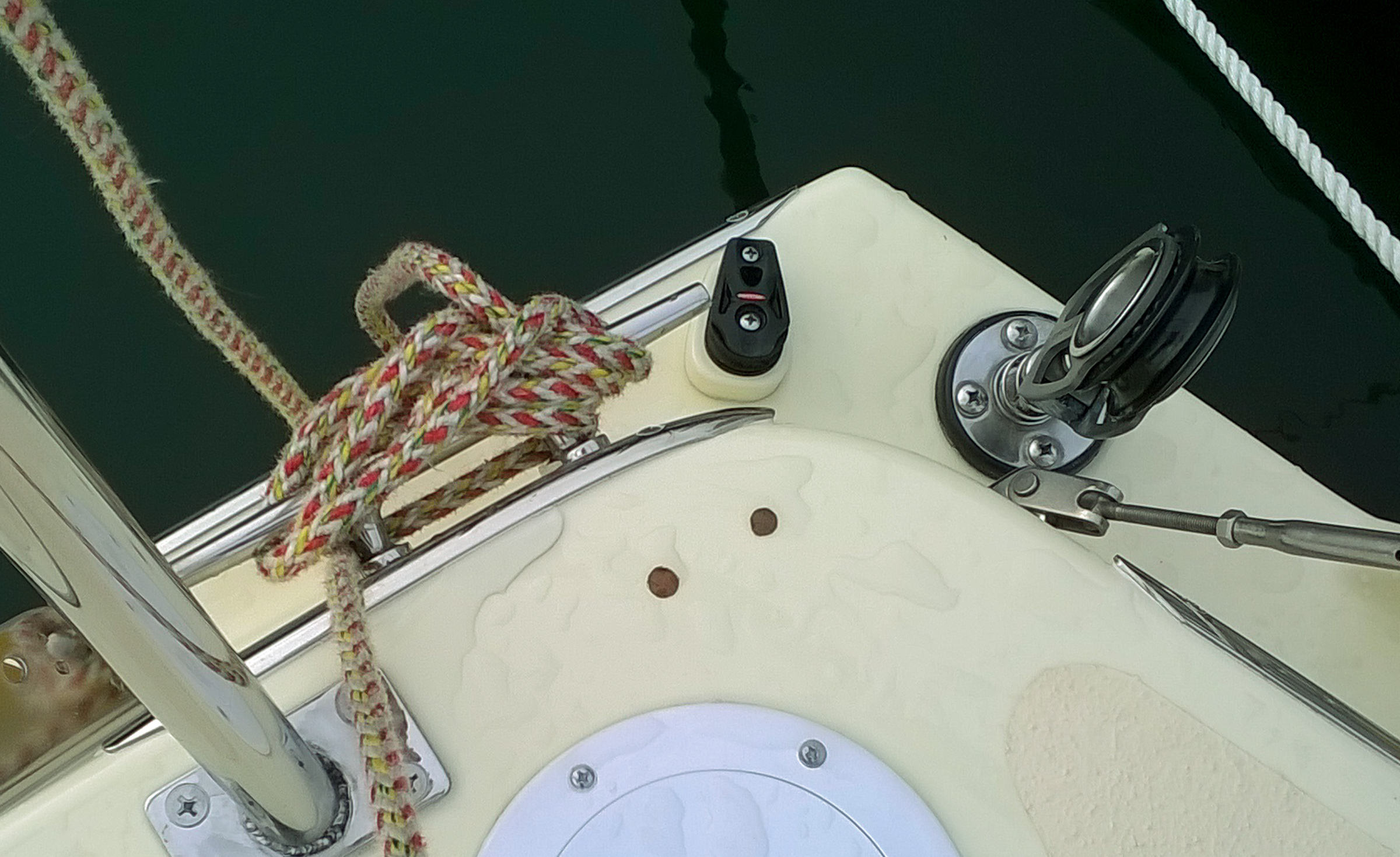 Big steps forward: boat in the water and gleaming, the first post-shop repair, new hardware bolting down. I wish that we could have been at the party to celebrate with you. Randy & Ruth