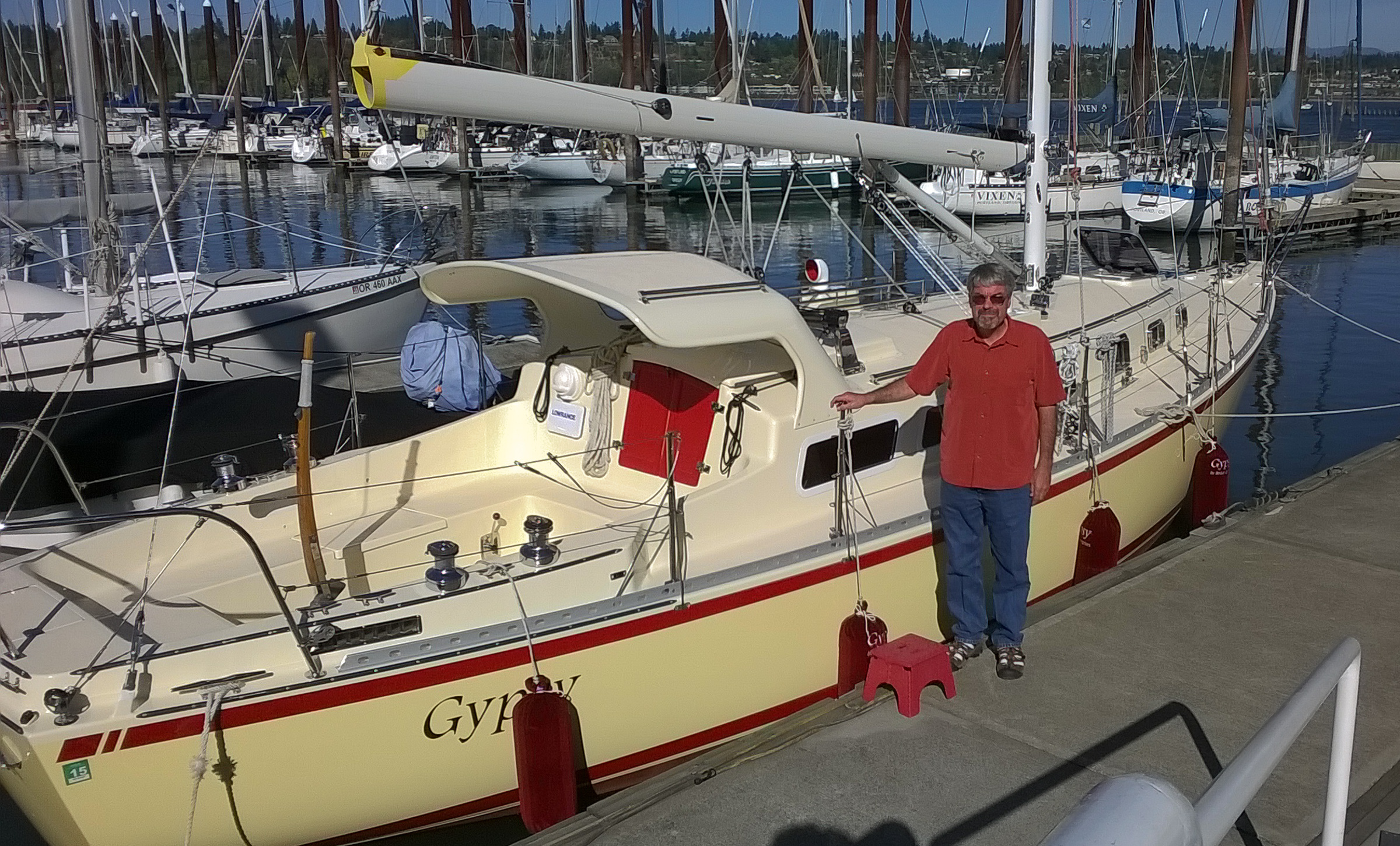 Washed and cleaned, Gypsy headed out into the Columbia River just long enough to let Nina move all the fenders from the port side to the starboard. We headed into our temporary party slip only to discover, on arrival, that the alternator bolt had sheared and that the alternator was now flailing around. Not good, but we made it into the slip with no other visible damage.