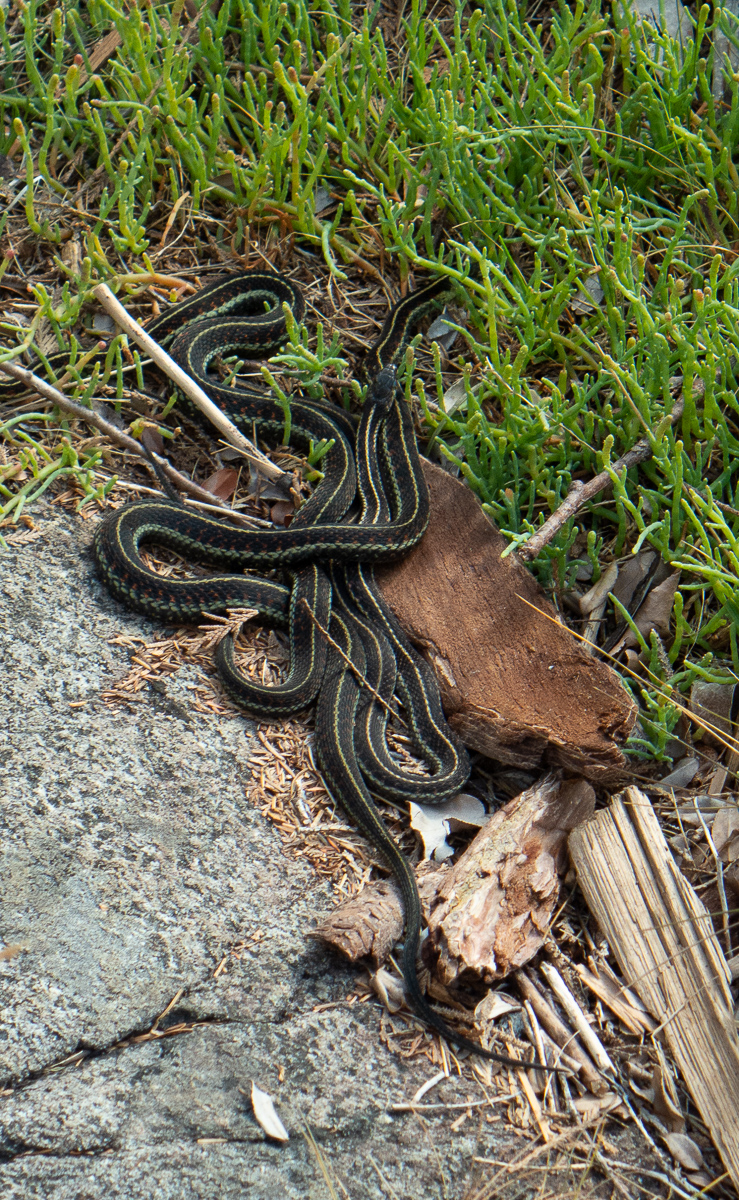 A knot of garter snakes basking.