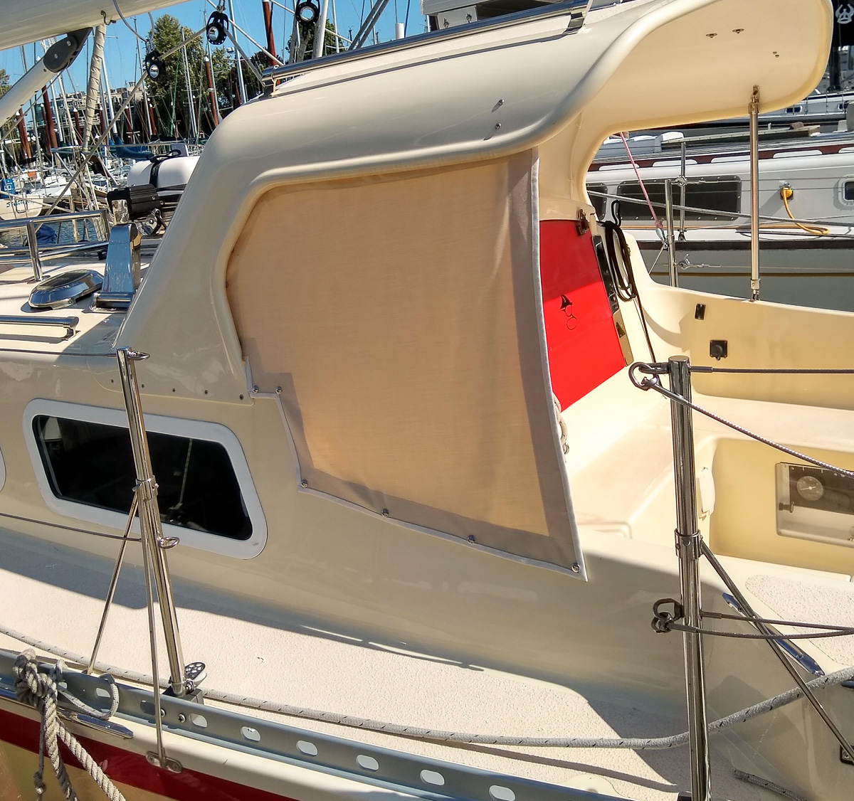 New side curtain. They will give us more wind and rain protection in the cockpit. Nina got a fancy snap tool . It has been a big help on canvas projects. It is much better than the budget bang the snaps together with a hammer.