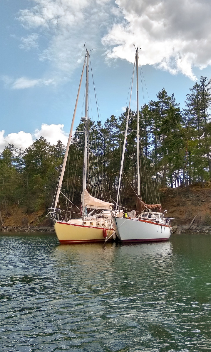 On the left: Gypsy and Drømen rafted up. Drømen has her anchor down and in this photo is also stern tied to the shore. Gypsy is tied up to Drømen. This way only one boat has to do all the anchoring. We’re rafted in Princess Cove on Wallace Island. Our respective dinghies are on the right.