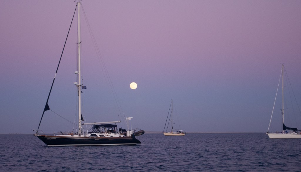 Lent our 130 genoa to Raven as they have no foresail. It fit enough for them to use for a bit. Bucket laundry before the party on the bluff. Got back to Gypsy only to discover that a pair of jeans had blown away. Just before sunset, there was a single cloud with a sheet lightning storm flashing away for at least half an hour. In a separate cloud off to the side, the full moon was rising. Pretty amazing.