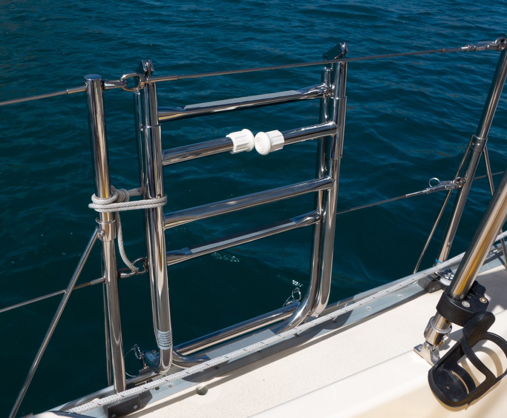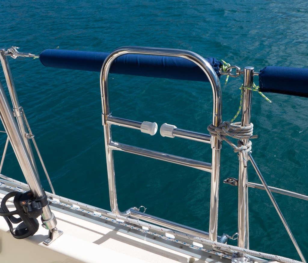 Bill made a teak swim ladder before we left Portland in 2019. It was a good idea that did not work well in practice. Gypsy now has two stainless steel ladders. One is a folding swim ladder and the other is a short boarding ladder. They mount to the toe rail with fast pins and can be switched from side to side. Gypsy has wide boarding gates, so the ladders don’t have to get lowered to use the gate.