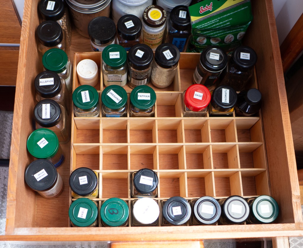 Spice drawer. Of the three or so types of spice bottles only the small square bottles fit. That’s what happens when you make something 1,800 miles away from the stuff you need to check it against.