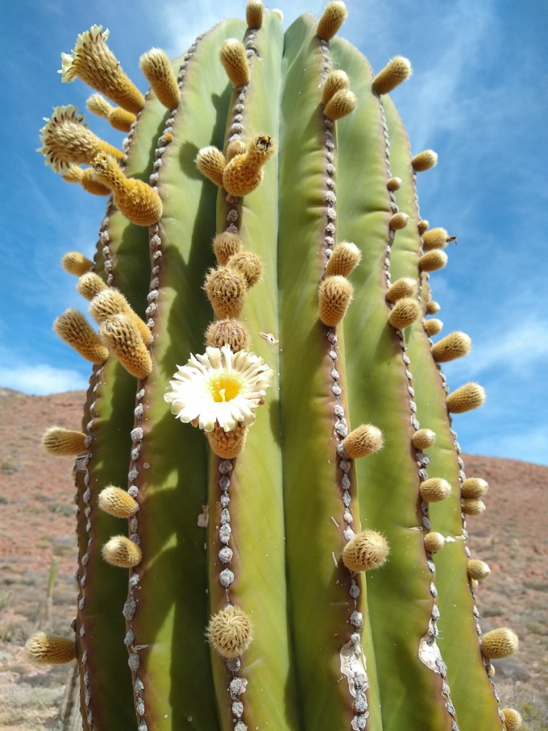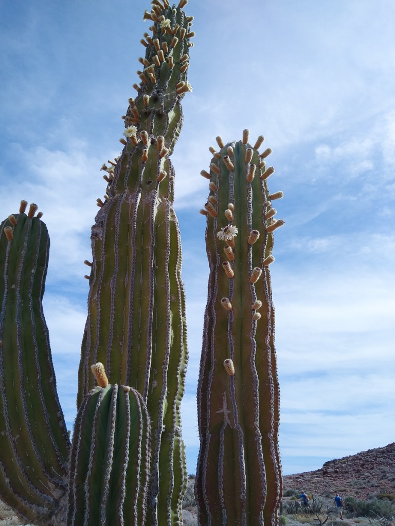 A cardón in bloom. They are also called Elephant Cactus. When the bloom fades and the flower falls off, the seed pods are very soft, and feathery, not at all prickly like a cactus. A forest of cardóns is a cardonal, thus the name of the ensenada.