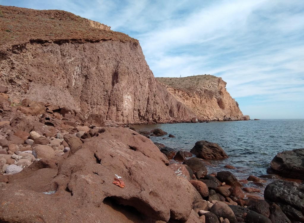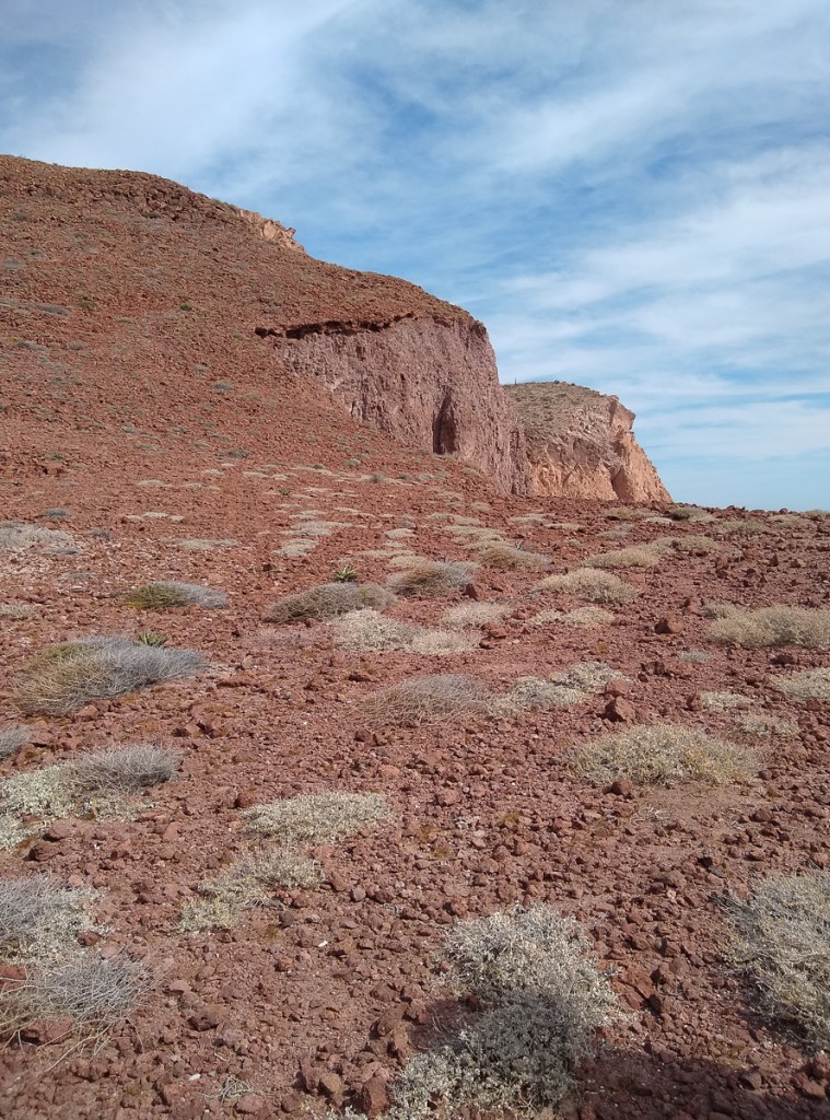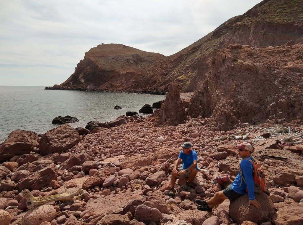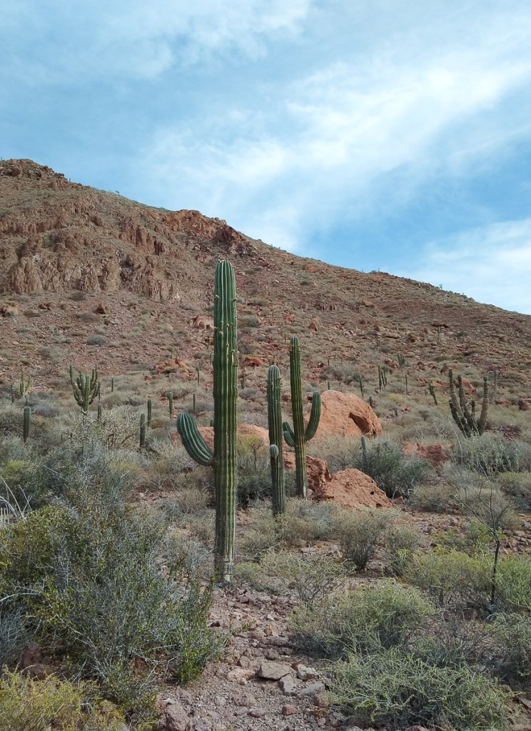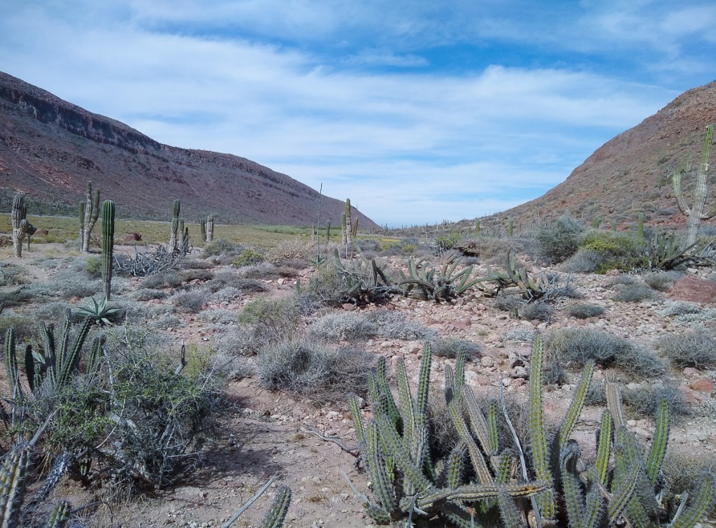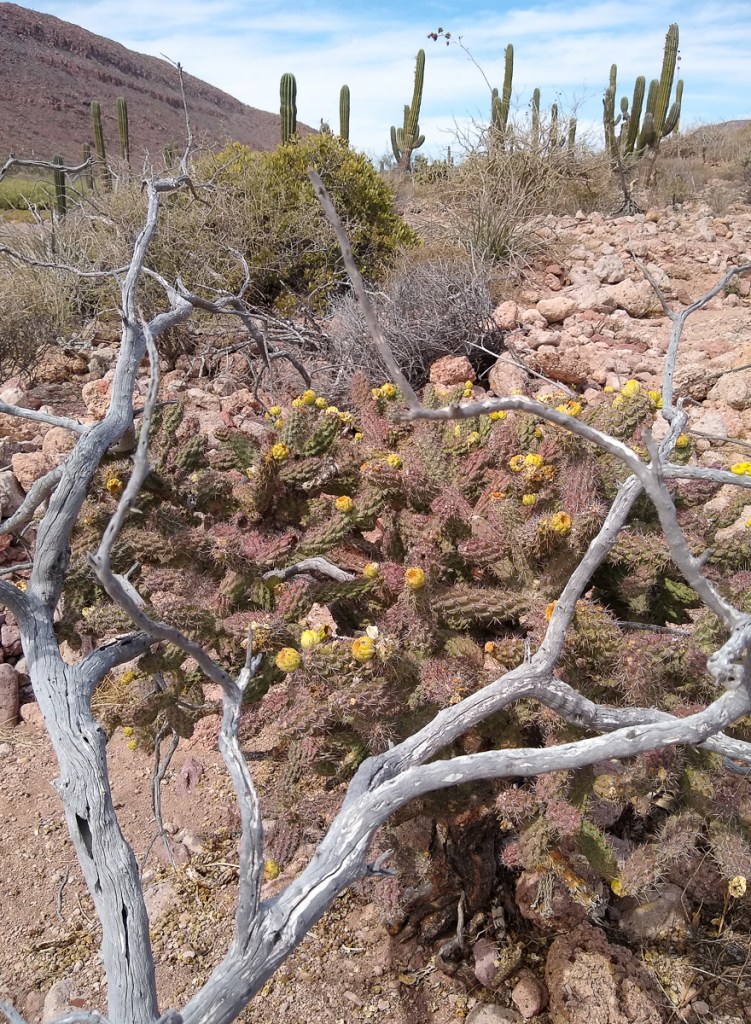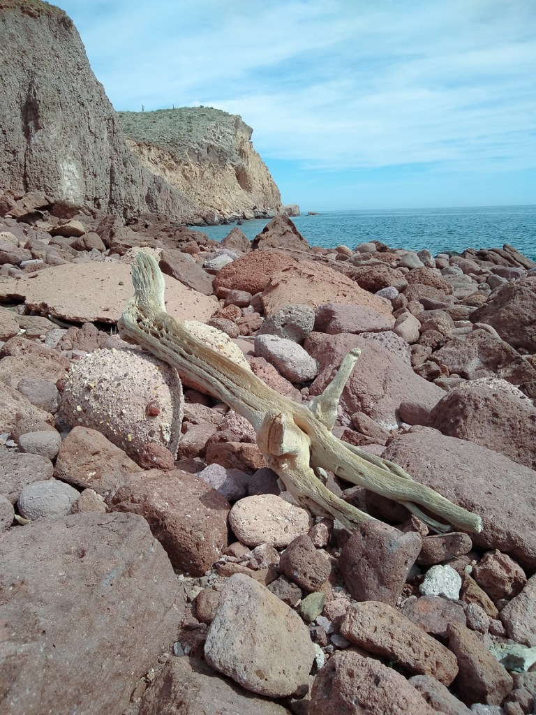 From Pichilingue, Gypsy and Dharma Girl buddy boated up to Isla Partida, the northern island of Espiritu Santo. On the way, big rays were jumping instead of whales. We dropped anchor Ensenada el Cardonal, where we had been foiled by a grassy bottom earlier in the year. We wanted to go back to Cardoncito but another boat beat us to it and it’s too small a cove for three boats. Cardonal is a lovely, bigger bay with room for more boats, and it does have a nice hike to the other side of the island.
