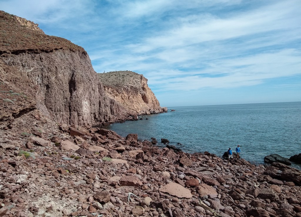 After a rolly night, it was time to move on. Winds were good for heading north. We got the spinnaker up for a little while. Fishing was catch and release seaweed. At one point, Nina looked back at Ensenada Grande through the binoculars and noticed a Princess cruise ship with what looked like a bunch of tenders in the water stopped outside the bay. We had counted five cruise ships parked outside of La Paz as we were on our way to Isla Partida. Forty-five minutes later they were on their way. We caught part of a news story later that there were protests in La Paz over the cruise ships staying in the bay.