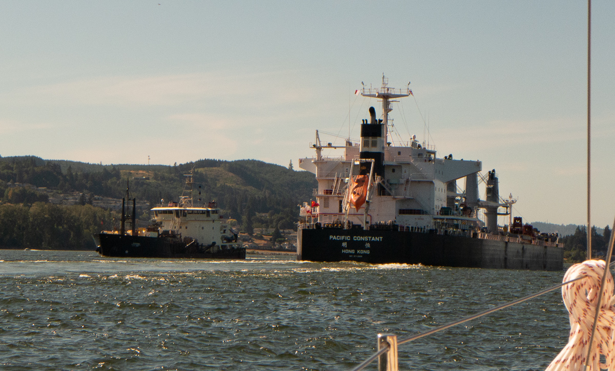 Near St. Helens, Oregon. The freighter is fully loaded and floating on its lines. You can see the hailing port on its transom. This ship is registered in Hong Kong. The smaller ship is a dredge. It is clearing sand from the river channel.