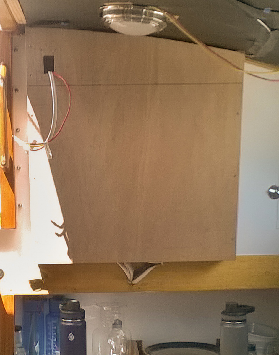 The cover for the instrument wiring. The wires in the upper left are for the backup anchor windlass switch. It will have a small Blue Seas panel to its right that will run the engine fan blower, engine room lights and deck light. We had mirrored plexi left from the adding the head mirrors, so that got hung on the cover as well.