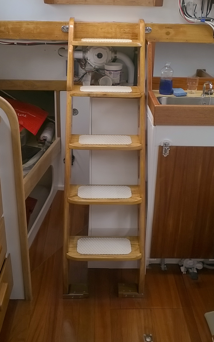 The ladder is varnished and we have our new Treadmaster steps. You can see that the quarter berth still needs varnish.