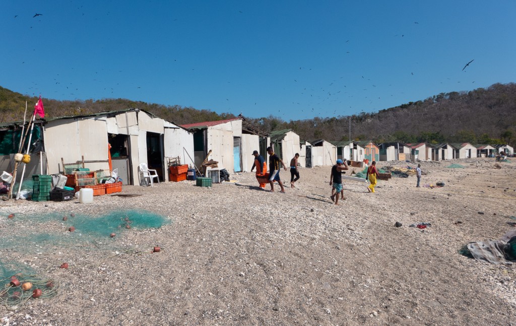 Isla San Marcos is known for its gypsum mining. We stayed upwind from the mine in a nice little cove called Sweet Pea Cove. Lots of net floats in the water nearby. There’s an abandoned fish camp on shore. There are sea caves in the coves nearby. Dolphins swim by. And flies. Thankfully they aren’t the biting kind, but they are an infernal nuisance and we must have swatted dozens of them. We had bees looking for fresh water. Usually we ignore them and they go away. One climbed into the head faucet. Later Nina pumped some water to wash her hands, and out gushed eight bees.