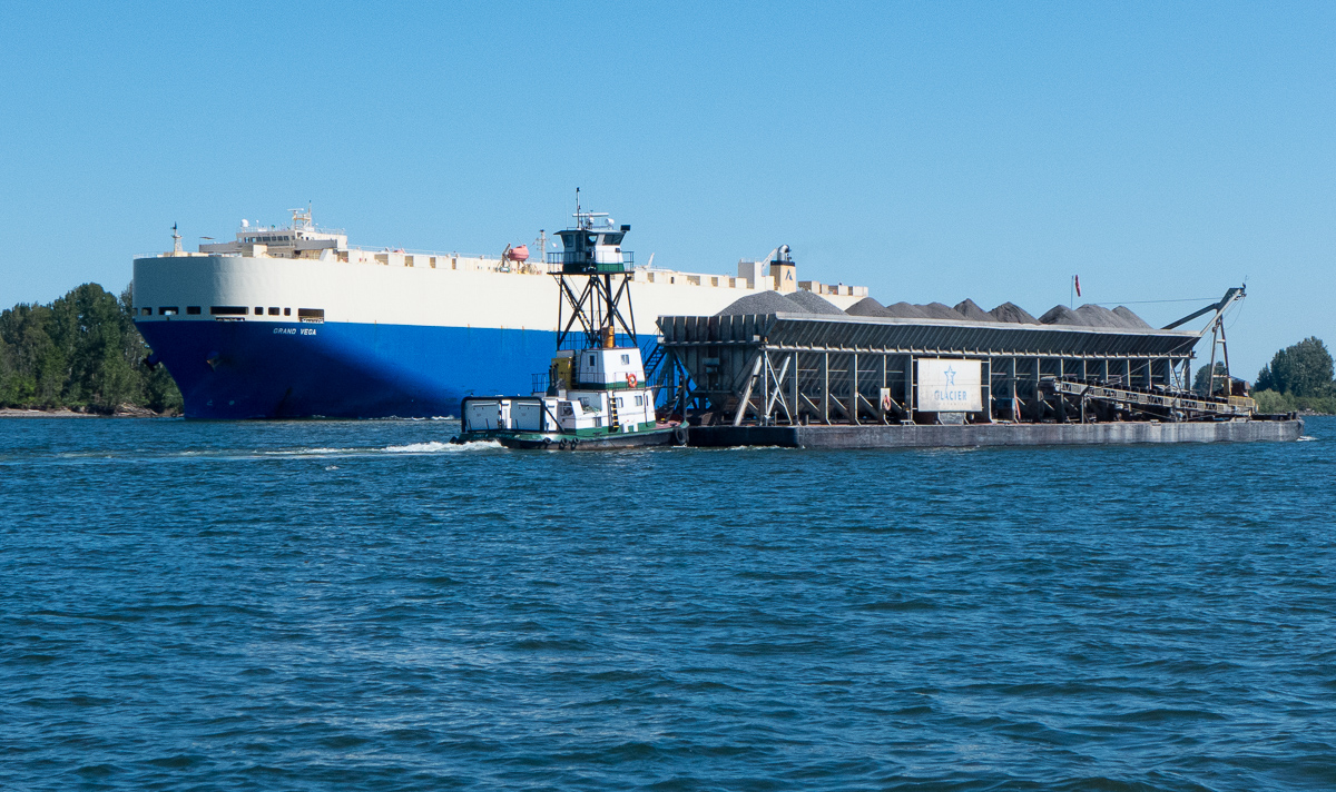 Tug pushing a gravel barge up river. The blue and white freighter behind is a car carrier. Portland is a major import and export port for cars.