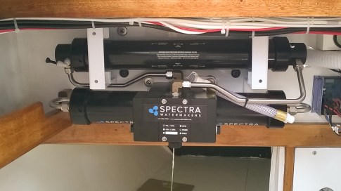 We also started installing our watermaker. This is the main pump and reverse osmosis membrane unit. It is mounted above the quarter berth. We wanted a location that had good access and this was about the only choice.