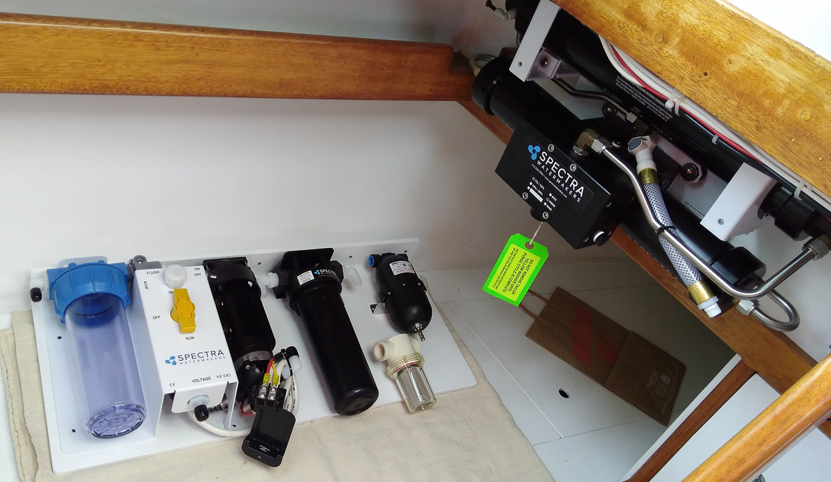 The rest of the gear for the watermaker will mount on the board that will hang below the shelf. Getting the layout settled was a big step. Now I just need to mount everything and run the plumbing.